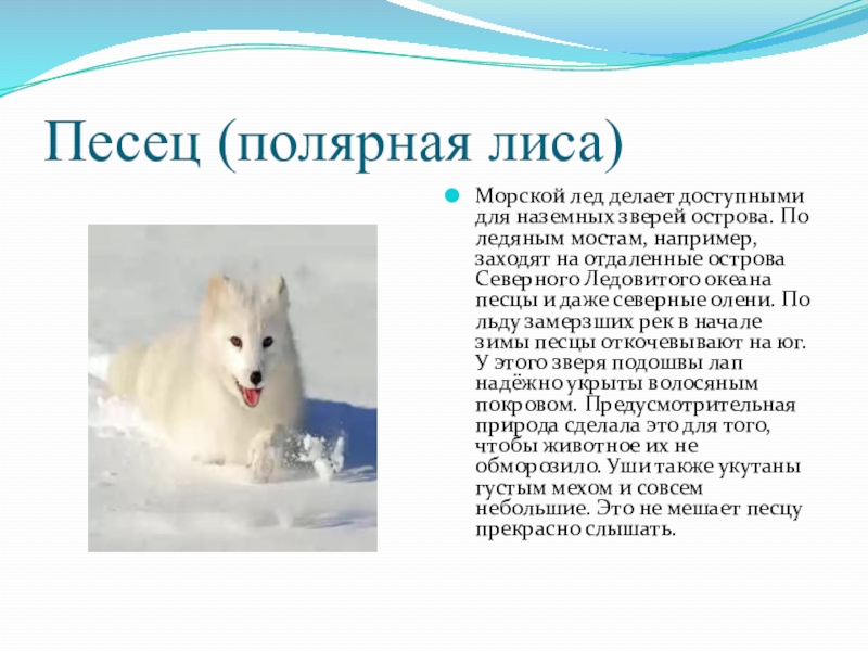 ледяным мостам, например, заходят на отдаленные острова Северного Ледовитого океана песцы и даже северные олени. По льду замерзших рек в начале зимы песцы откочевывают на юг. У этого зверя подошвы лап надёжно укрыты волосяным покровом. Предусмотрительная природа сделала это для того, чтобы животное их не обморозило. Уши также укутаны густым мехом и совсем небольшие. Это не мешает песцу прекрасно слышать.
