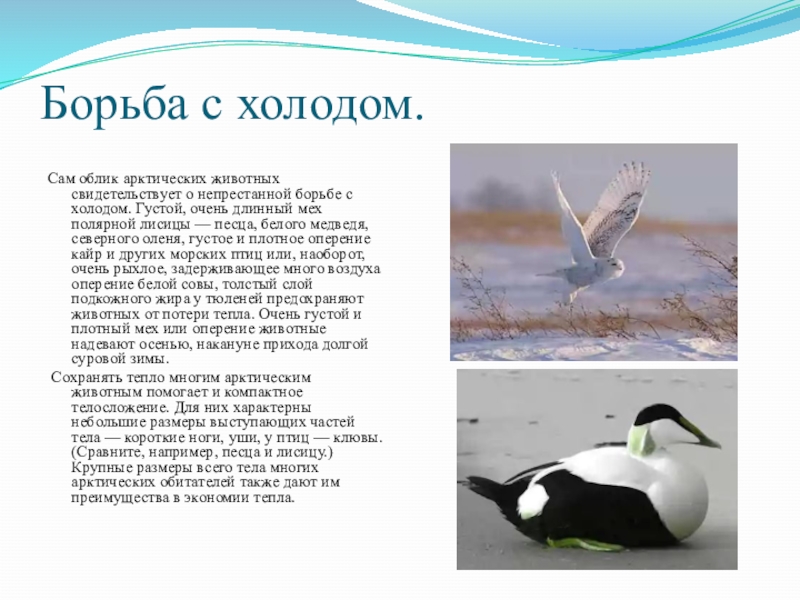 холодом. Густой, очень длинный мех полярной лисицы — песца, белого медведя, северного оленя, густое и плотное оперение кайр и других морских птиц или, наоборот, очень рыхлое, задерживающее много воздуха оперение белой совы, толстый слой подкожного жира у тюленей предохраняют животных от потери тепла. Очень густой и плотный мех или оперение животные надевают осенью, накануне прихода долгой суровой зимы.