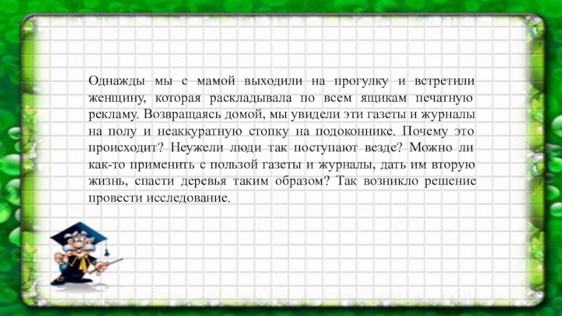 раскладывала по всем ящикам печатную рекламу. Возвращаясь домой, мы увидели эти газеты и журналы на полу и неаккуратную стопку на подоконнике. Почему это происходит? Неужели люди так поступают везде? Можно ли как-то применить с пользой газеты и журналы, дать им вторую жизнь, спасти деревья таким образом? Так возникло решение провести исследование.