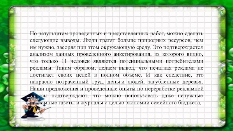 тратят больше природных ресурсов, чем им нужно, засоряя при этом окружающую среду. Это подтверждается анализом данных проведенного анкетирования, из которого видно, что только 11 человек являются потенциальными потребителями рекламы. Таким образом, делаем вывод, что печатная реклама не достигает своих целей в полном объеме. И как следствие, это напрасно потраченный труд, деньги людей, загубленные деревья. Наши предложения и проведенные опыты по переработке рекламной прессы подтверждают, что можно использовать даже ненужные рекламные газеты и журналы с целью экономии семейного бюджета.
