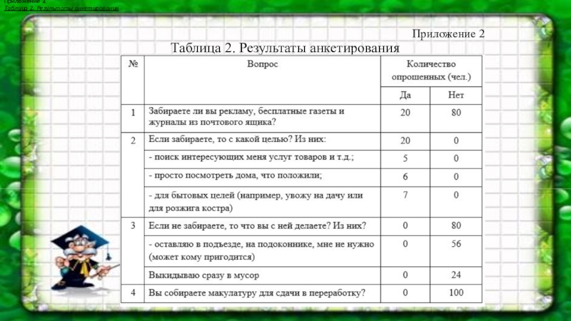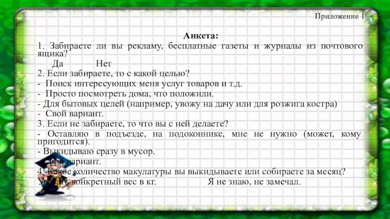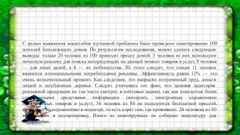 100 жителей близлежащих домов. По результатам исследования, можно сделать следующие выводы: только 20 человек из 100 приносят прессу домой. 5 человек из них используют печатную рекламу для поиска интересующих на данный момент товаров и услуг, 9 человек — для иных целей, а 6 — из любопытства. Из этого следует, что только 11 человек являются потенциальными потребителями рекламы. Эффективность равна 11% — это очень незначительный процент. Как следствие, это напрасно потраченный труд, деньги людей и загубленные деревья. Следует учитывать тот факт, что целевая аудитория рекламной продукции не так часто смотрит в почтовые ящики, так как пользуется более современными средствами информации (интернет, электронные справочники предлагаемых товаров и услуг). 56 человек из 80 не пользуются бесплатной прессой, оставляют на подоконнике в подъезде, то есть сорят там, где проживают. 24 человека из 80 выкидывают в мусоропровод. Никто из анкетируемых не собирает макулатуру для переработки.