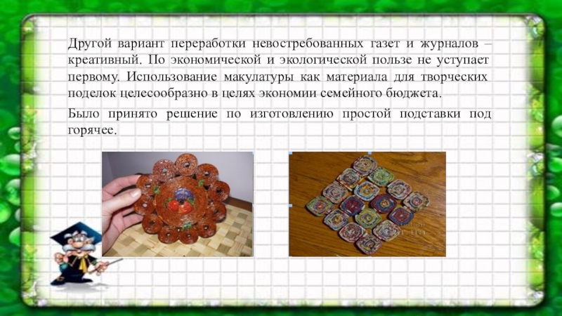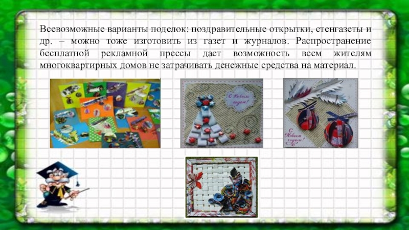 Слайд 9Другой вариант переработки невостребованных газет и журналов – креативный. По экономической