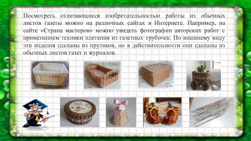 сайтах в Интернете. Например, на сайте «Страна мастеров» можно увидеть фотографии авторских работ с применением техники плетения из газетных трубочек. По внешнему виду эти изделия сделаны из прутиков, но в действительности они сделаны из обычных листов газет и журналов.