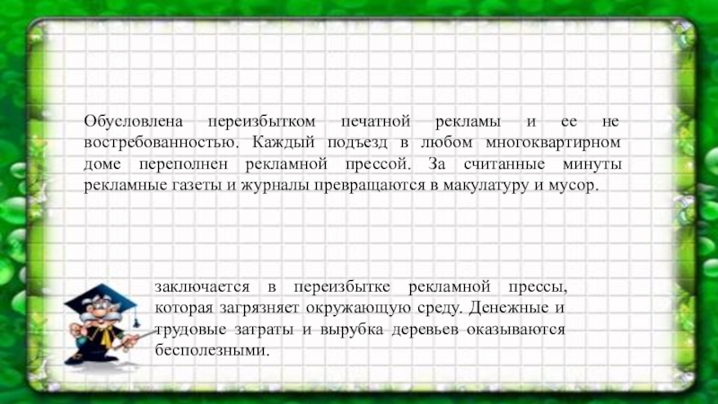 заключается в переизбытке рекламной прессы, которая загрязняет окружающую среду. Денежные и трудовые затраты и вырубка деревьев оказываются бесполезными.