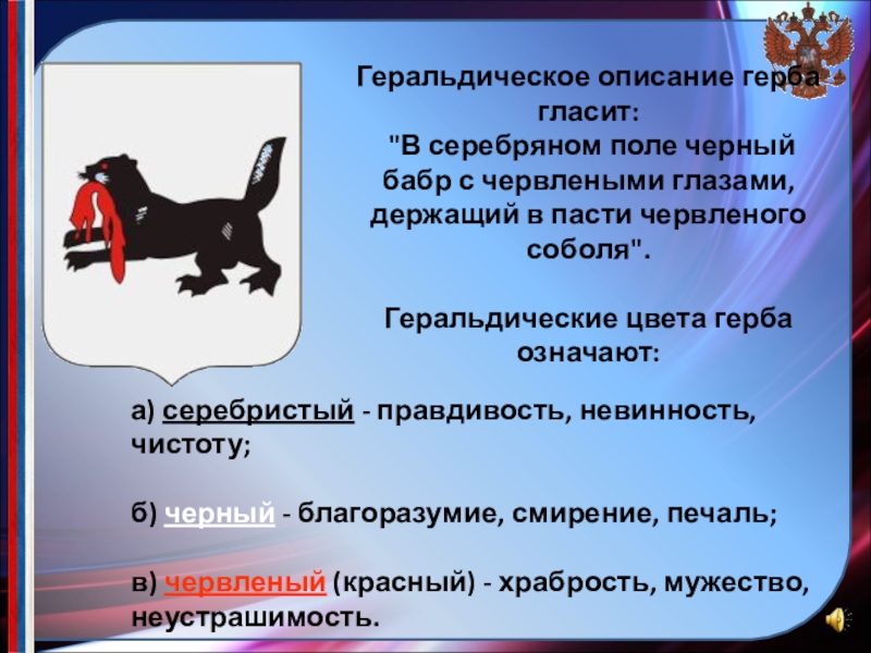в) червленый (красный) - храбрость, мужество, неустрашимость.
