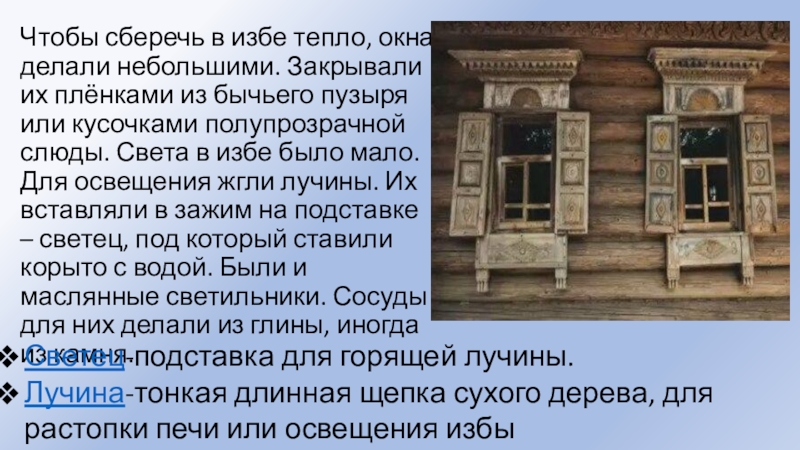 Лучина-тонкая длинная щепка сухого дерева, для растопки печи или освещения избы