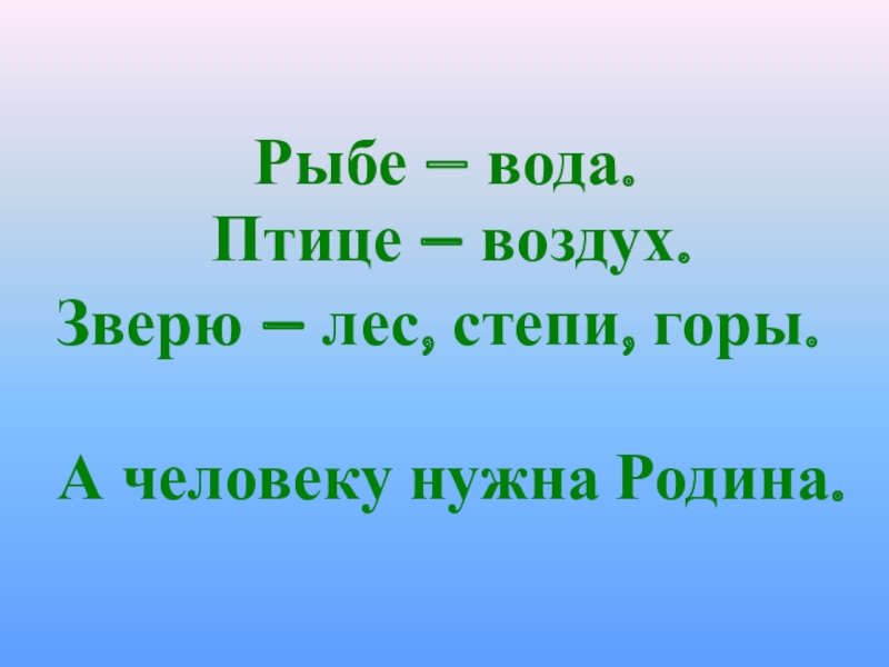 Рыбе – вода.Птице – воздух.Зверю – лес, степи, горы.А человеку нужна Родина.