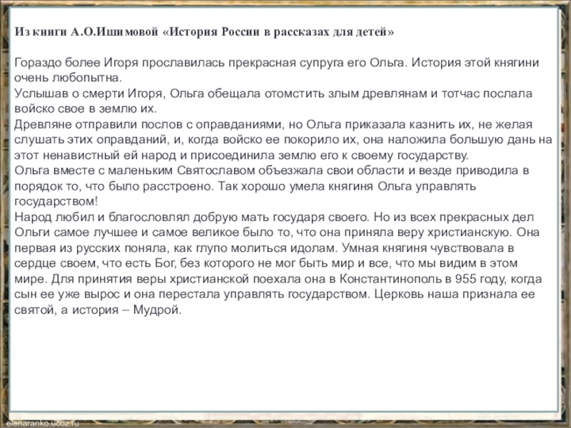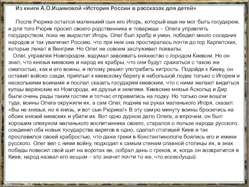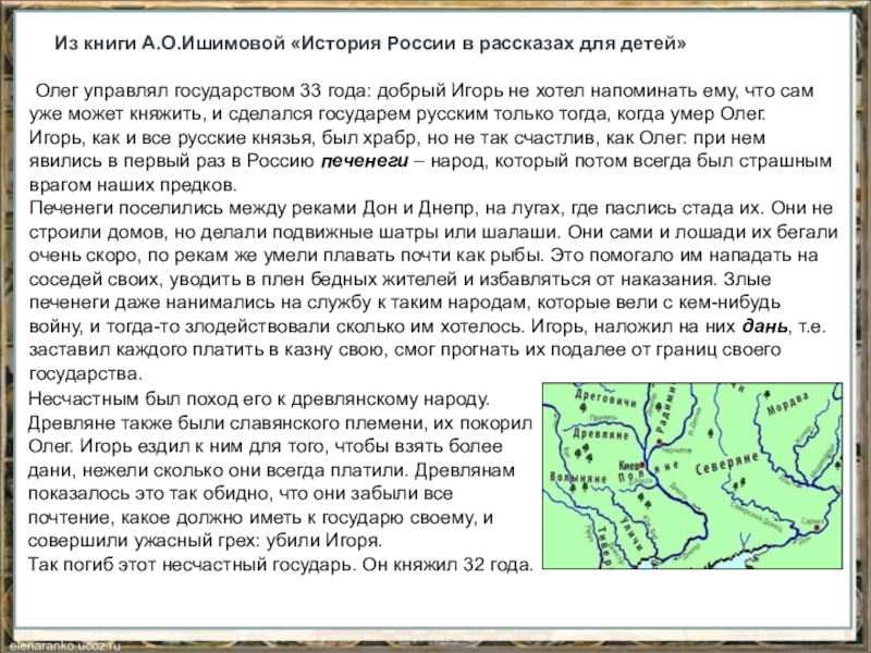 Несчастным был поход его к древлянскому народу. Древляне также были славянского племени, их покорил Олег. Игорь ездил к ним для того, чтобы взять более дани, нежели сколько они всегда платили. Древлянам показалось это так обидно, что они забыли все почтение, какое должно иметь к государю своему, и совершили ужасный грех: убили Игоря.