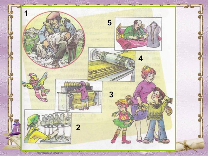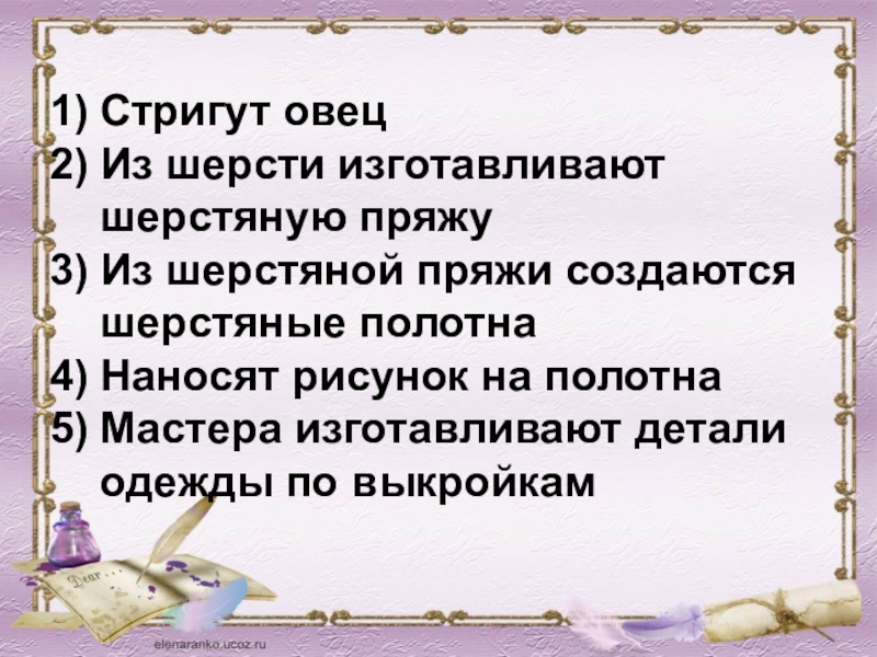Стригут овецИз шерсти изготавливают шерстяную пряжуИз шерстяной пряжи создаются шерстяные полотнаНаносят рисунок на полотнаМастера изготавливают детали одежды
