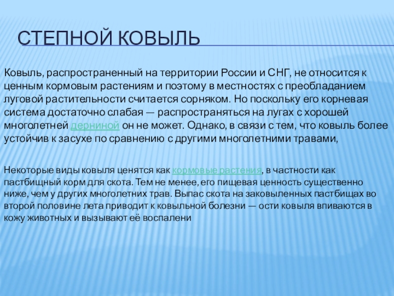 Некоторые виды ковыля ценятся как кормовые растения, в частности как пастбищный корм для скота. Тем не менее, его пищевая ценность существенно ниже, чем у других многолетних трав. Выпас скота на заковыленных пастбищах во второй половине лета приводит к ковыльной болезни — ости ковыля впиваются в кожу животных и вызывают её воспалени