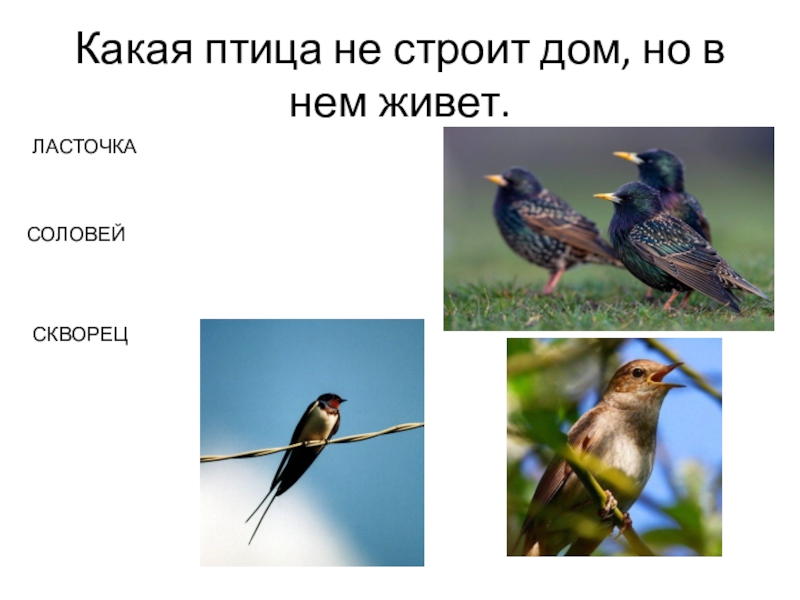 Какая птица не строит дом, но в нем живет.ЛАСТОЧКАСОЛОВЕЙСКВОРЕЦ