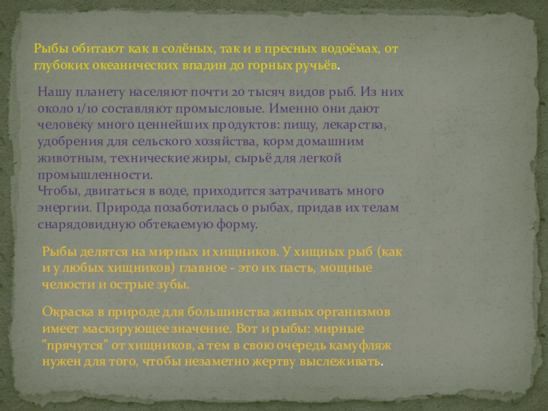 Нашу планету населяют почти 20 тысяч видов рыб. Из них около 1/10 составляют промысловые. Именно они дают человеку много ценнейших продуктов: пищу, лекарства, удобрения для сельского хозяйства, корм домашним животным, технические жиры, сырьё для легкой промышленности.