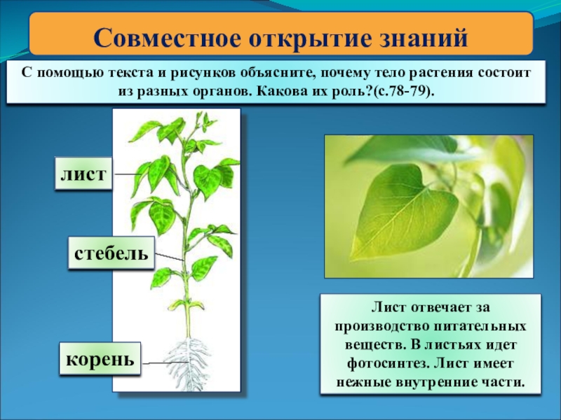 Лист отвечает за производство питательных веществ. В листьях идет фотосинтез. Лист имеет нежные внутренние части.