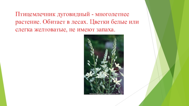 Слайд 15Птицемлечник дуговидный - многолетнее растение. Обитает в лесах. Цветки белые или