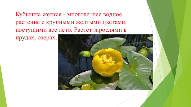 Слайд 14Кубышка желтая - многолетнее водное растение с крупными желтыми цветами, цветущими