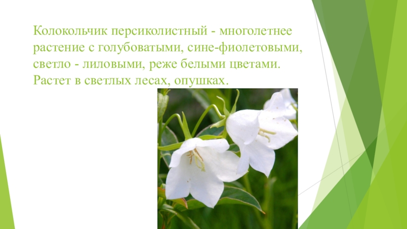 Слайд 11Колокольчик персиколистный - многолетнее растение с голубоватыми, сине-фиолетовыми, светло - лиловыми,