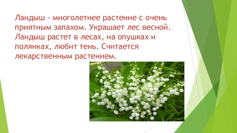 Слайд 9Ландыш - многолетнее растение с очень приятным запахом. Украшает лес весной.