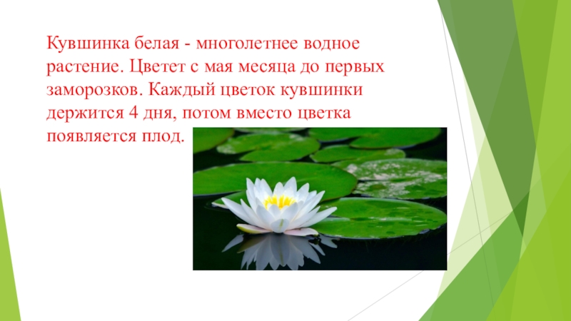 Слайд 13Кувшинка белая - многолетнее водное растение. Цветет с мая месяца до