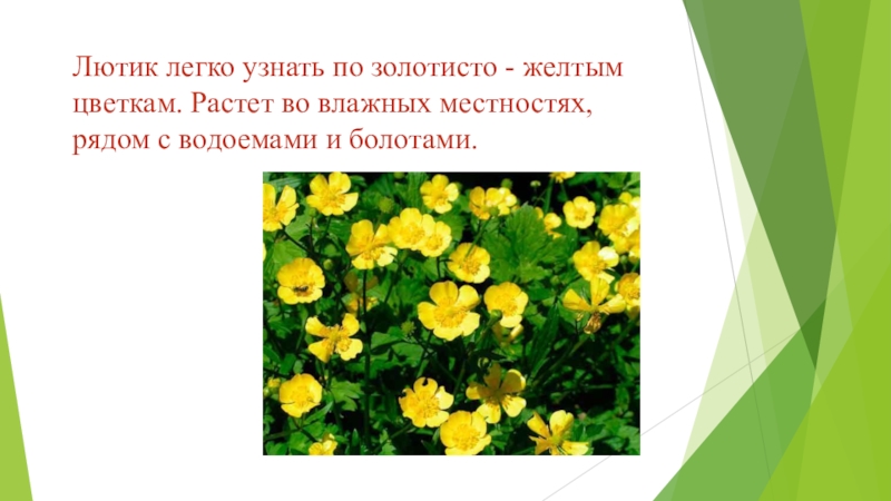 Слайд 10Лютик легко узнать по золотисто - желтым цветкам. Растет во влажных