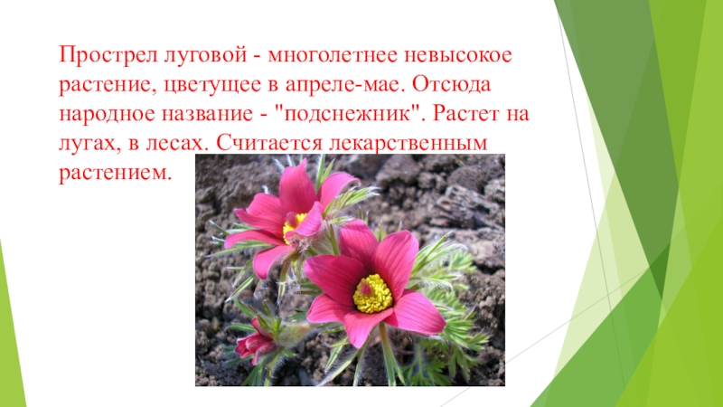 Слайд 12Прострел луговой - многолетнее невысокое растение, цветущее в апреле-мае. Отсюда народное