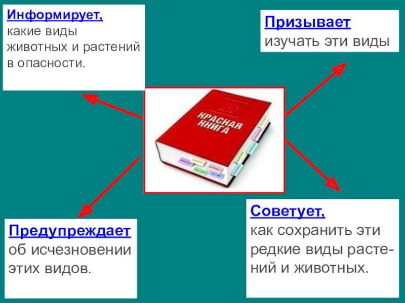 Информирует,какие виды животных и растенийв опасности.Призываетизучать эти видыПредупреждаетоб исчезновенииэтих видов.Советует,как сохранить этиредкие виды расте-ний и животных.