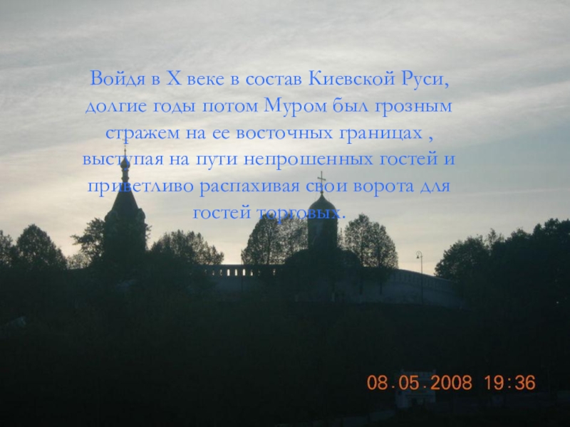 из древнейших русских городов - Муром, упоминаемый в начальной летописи русского государства «Повести временных лет» под 862 годом. Имя городу дали по названию фино-угорского племени «мурома»,жившему здесь до прихода славян.