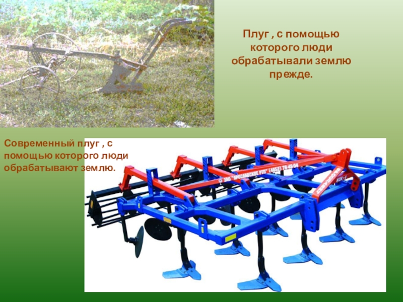 Плуг , с помощью которого люди обрабатывали землю прежде.Современный плуг , с помощью которого люди обрабатывают землю.