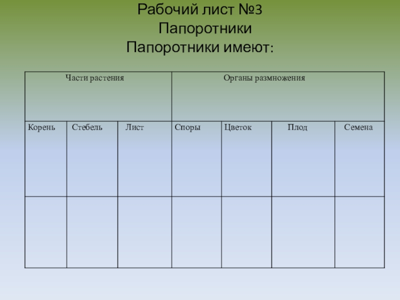 Слайд 8Рабочий лист №3 Папоротники Папоротники имеют: