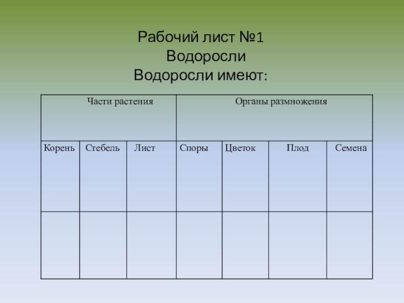 Слайд 6 Рабочий лист №1 Водоросли Водоросли имеют: