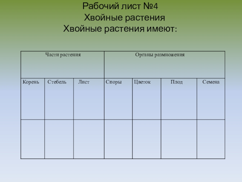Слайд 9Рабочий лист №4 Хвойные растения Хвойные растения имеют: