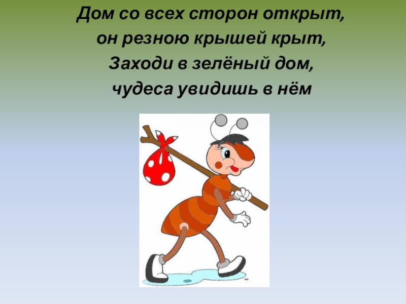 Дом со всех сторон открыт, он резною крышей крыт,Заходи в зелёный дом, чудеса увидишь в нём