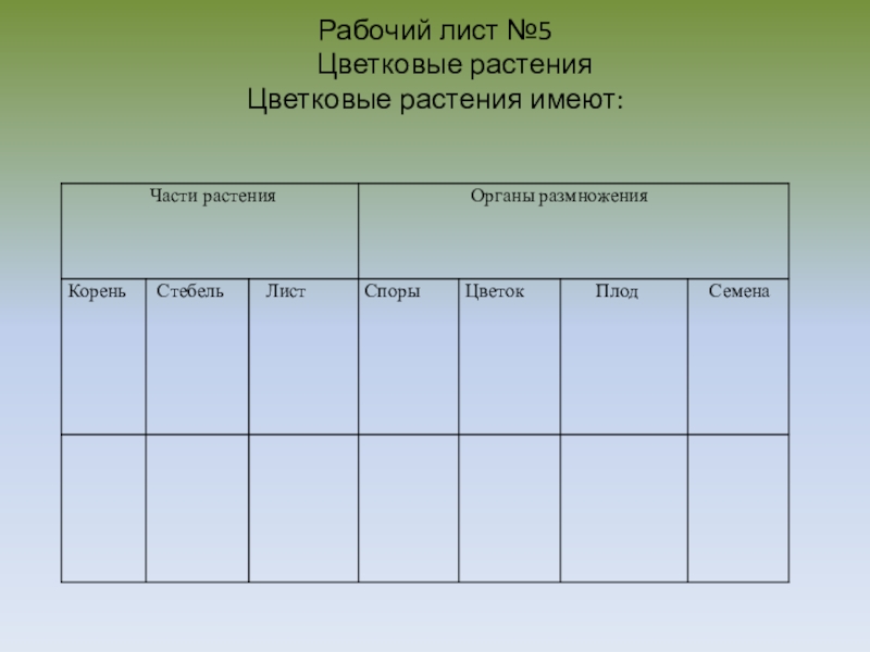 Слайд 10Рабочий лист №5 Цветковые растения Цветковые растения имеют:
