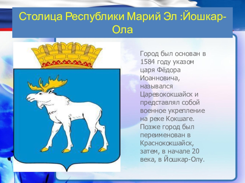 Столица Республики Марий Эл :Йошкар-ОлаГород был основан в 1584 году указом царя Фёдора Иоанновича, назывался Царевококшайск и