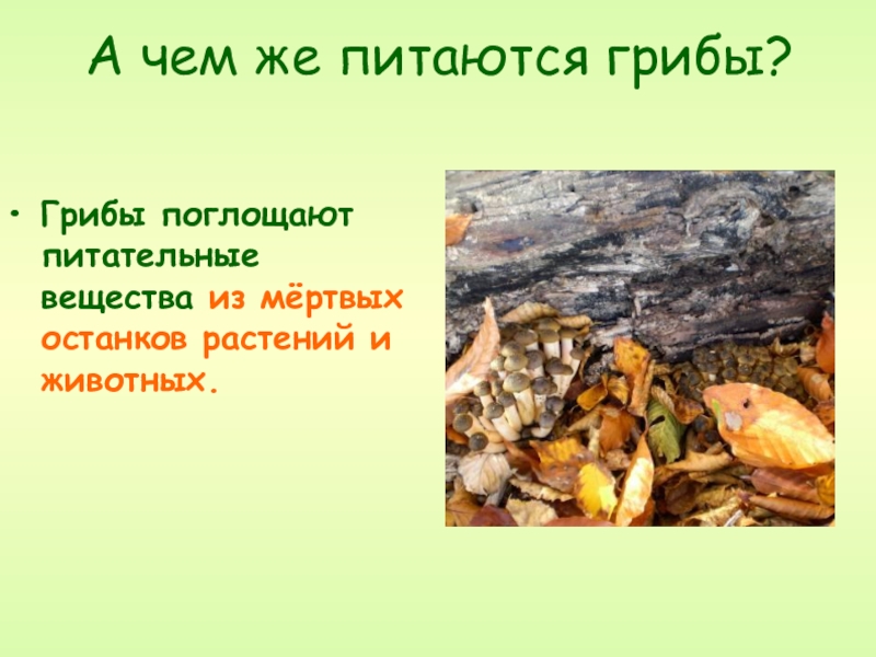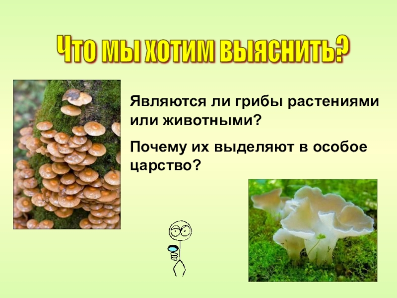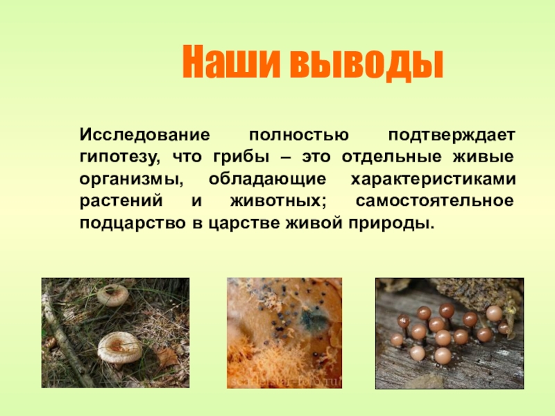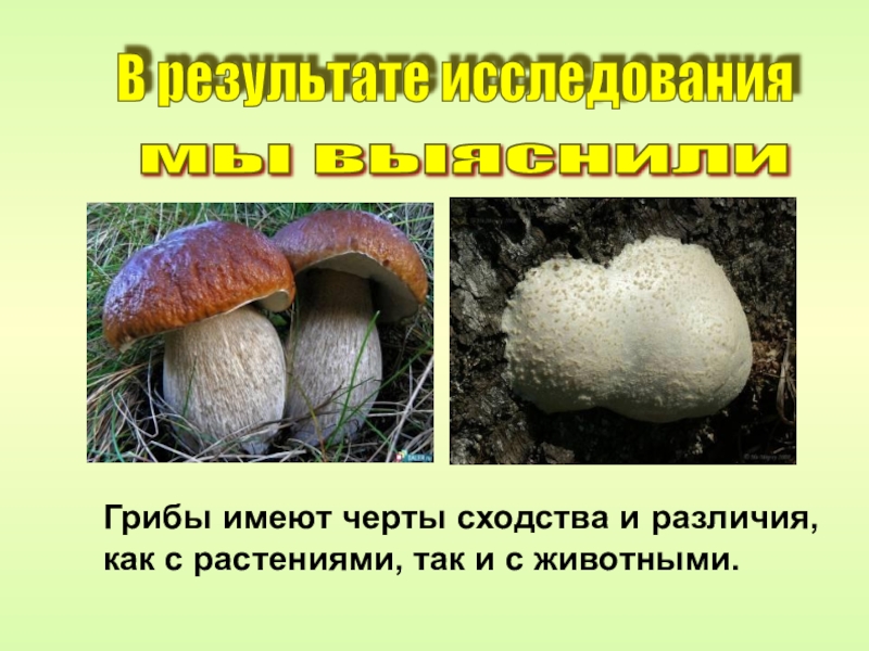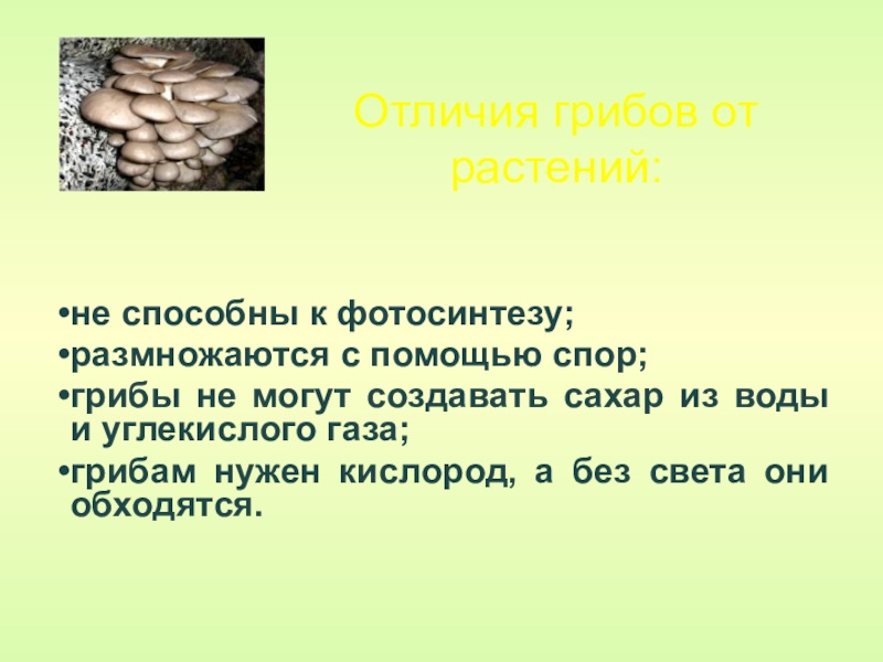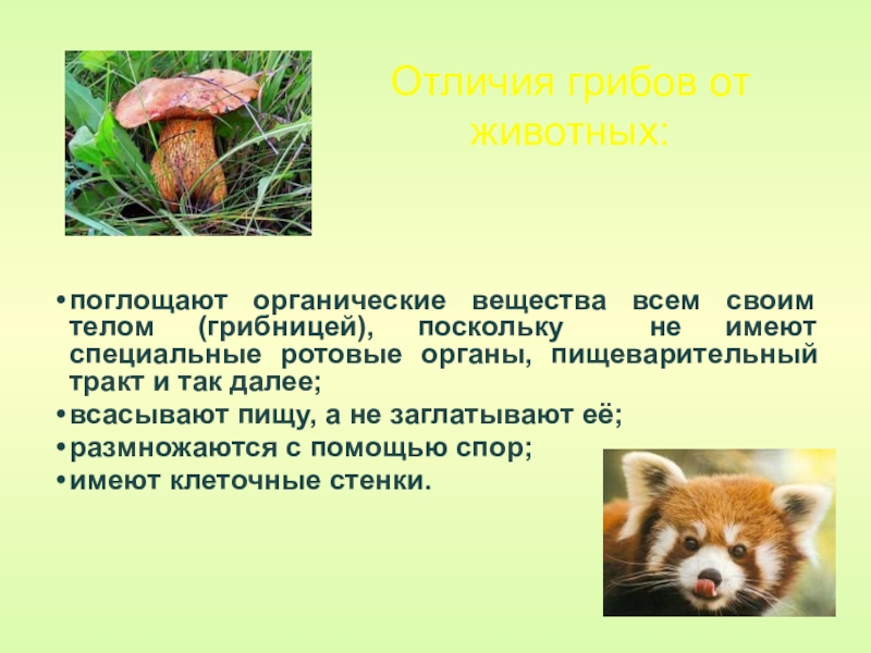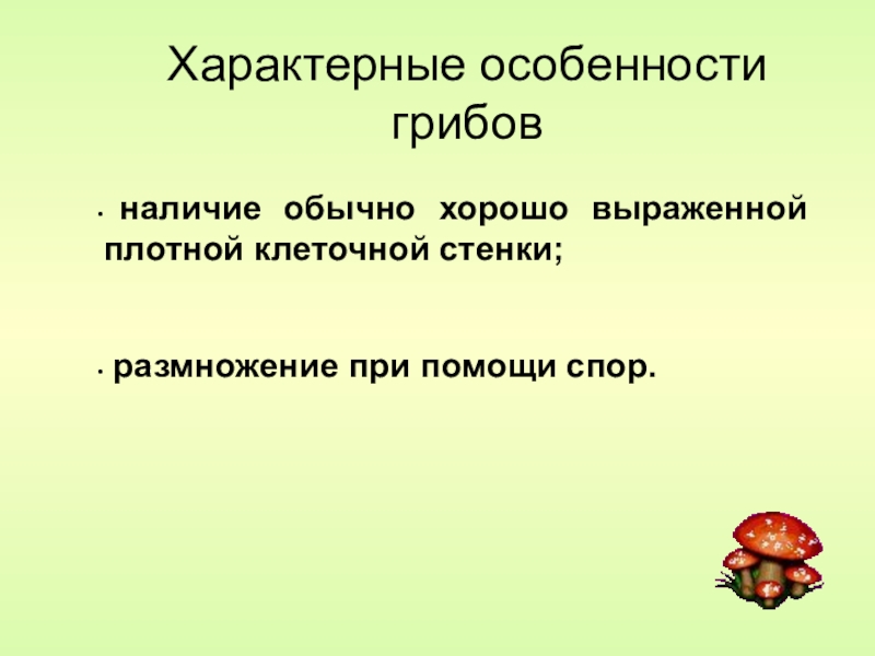 Грибы, как и растения, неподвижны, растут в течение всей жизни, всасывают питательные вещества всей поверхностью тела, а не заглатывают их, как животные. У клетки гриба имеется твёрдая оболочка, как и у растений.