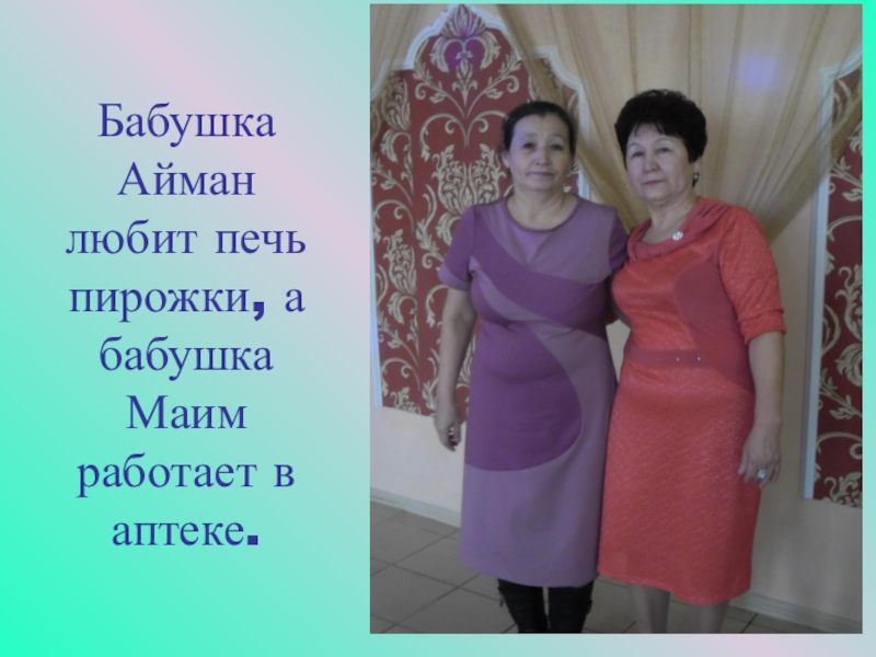 Слайд 9Бабушка Айман любит печь пирожки, а бабушка Маим работает в аптеке.