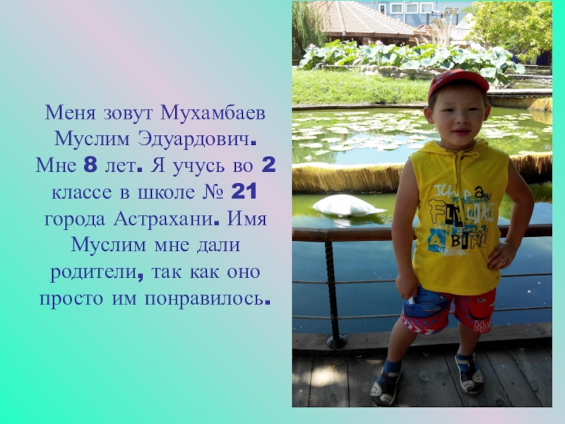 Слайд 3Меня зовут Мухамбаев Муслим Эдуардович. Мне 8 лет. Я учусь во