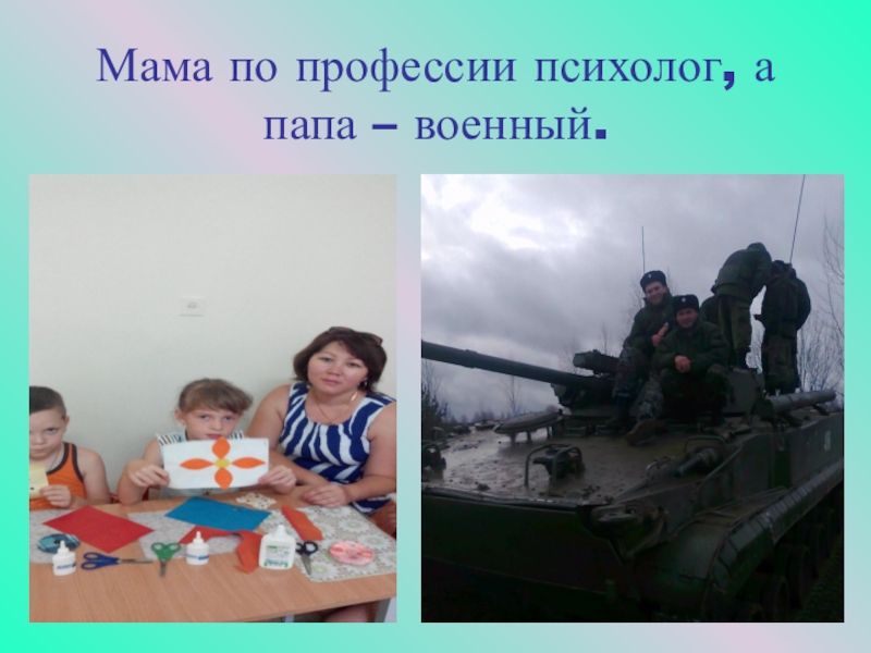 Слайд 7Мама по профессии психолог, а папа – военный.
