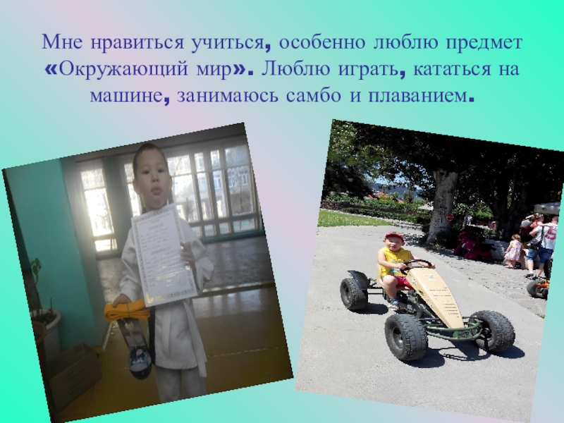 Мне нравиться учиться, особенно люблю предмет «Окружающий мир». Люблю играть, кататься на машине, занимаюсь самбо и плаванием.