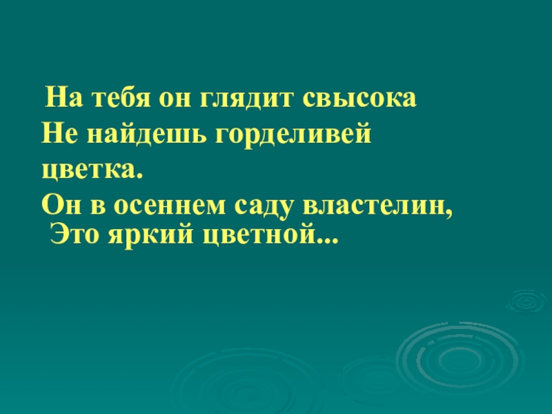 На тебя он глядит свысока Не найдешь горделивей цветка. Он в осеннем саду властелин, Это