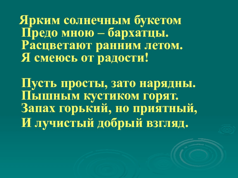 ранним летом. Я смеюсь от радости! Пусть просты, зато нарядны. Пышным кустиком горят. Запах горький, но приятный, И лучистый добрый взгляд.