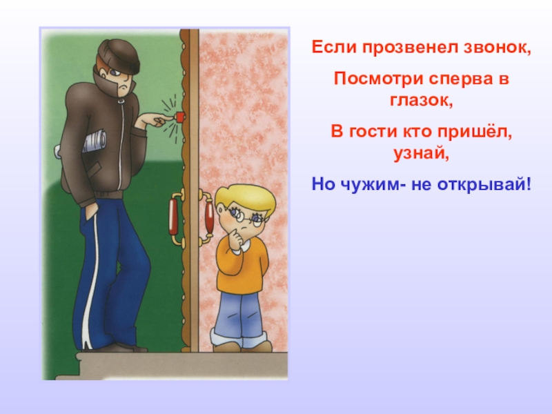 Если прозвенел звонок,Посмотри сперва в глазок,В гости кто пришёл, узнай,Но чужим- не открывай!