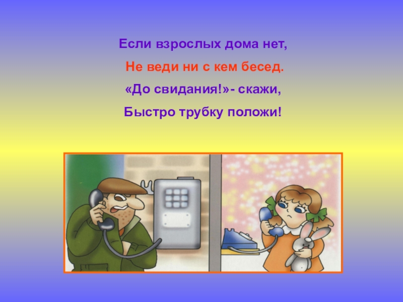 Если взрослых дома нет, Не веди ни с кем бесед.«До свидания!»- скажи,Быстро трубку положи!