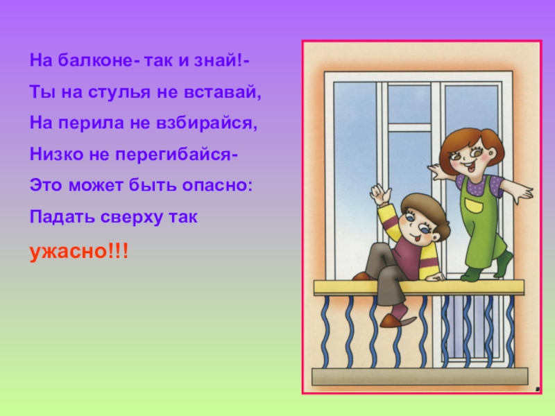 На балконе- так и знай!-Ты на стулья не вставай,На перила не взбирайся,Низко не перегибайся-Это может быть опасно:Падать