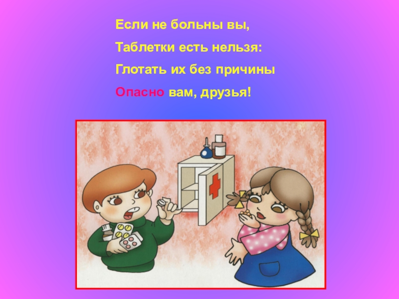 Если не больны вы,Таблетки есть нельзя:Глотать их без причиныОпасно вам, друзья!