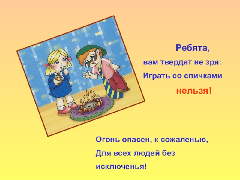 Ребята, вам твердят не зря:Играть со спичками нельзя!Огонь опасен, к сожаленью,Для всех людей без исключенья!