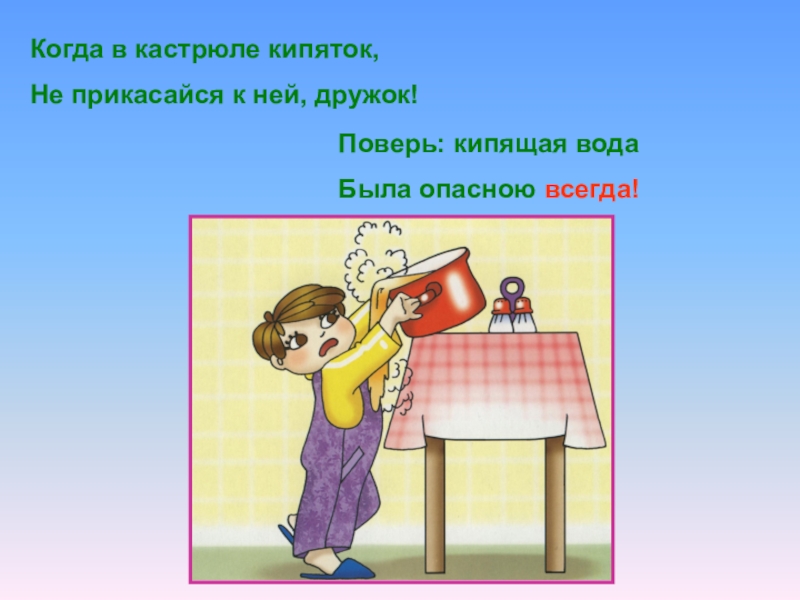 Когда в кастрюле кипяток,Не прикасайся к ней, дружок!Поверь: кипящая водаБыла опасною всегда!