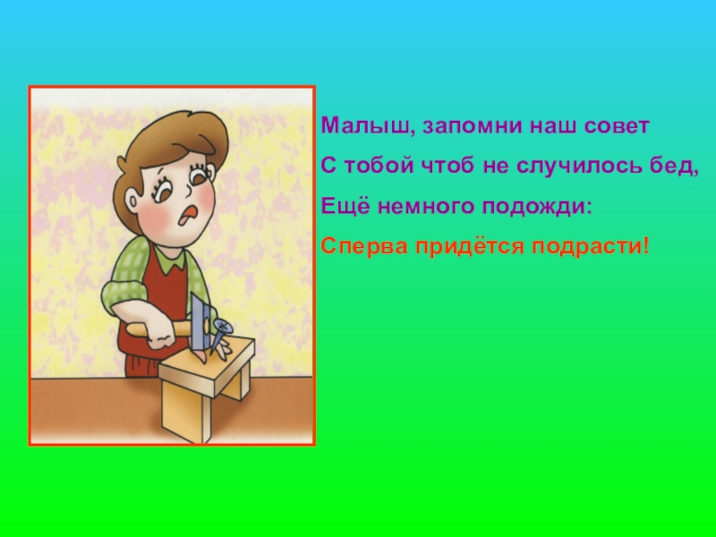 Малыш, запомни наш советС тобой чтоб не случилось бед,Ещё немного подожди:Сперва придётся подрасти!