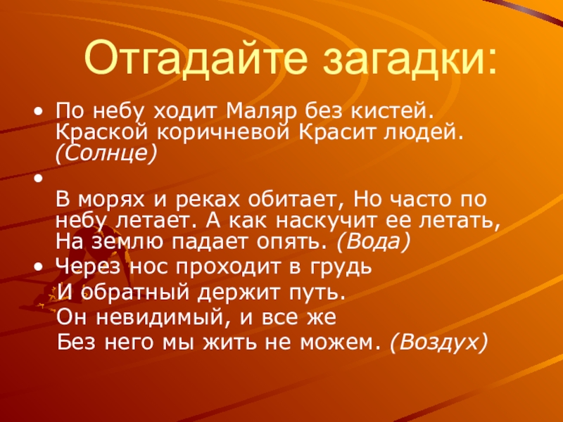 Отгадайте загадки:По небу ходит Маляр без кистей. Краской коричневой Красит людей.  (Солнце) В морях и