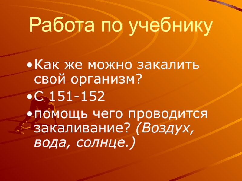 Работа по учебнику Как же можно закалить свой организм? С 151-152помощь чего проводится закаливание? (Воздух, вода, солнце.)