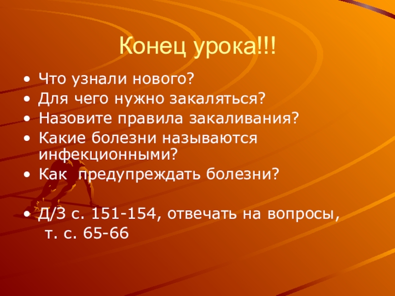 Конец урока!!!Что узнали нового?Для чего нужно закаляться?Назовите правила закаливания?Какие болезни называются инфекционными?Как предупреждать болезни?Д/З с. 151-154, отвечать